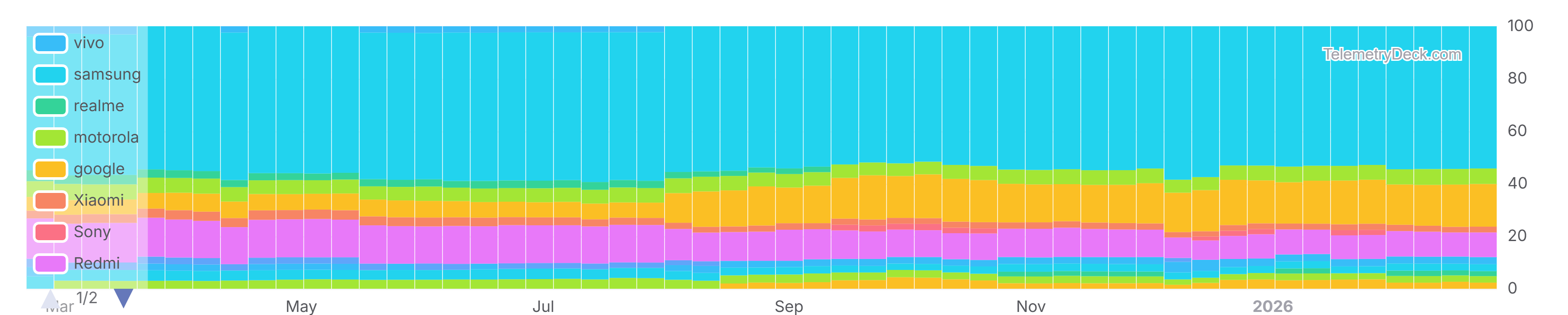 - The share of Redmi has decreased since the middle of 2025 and was at 9.39% at the end of February 2026.