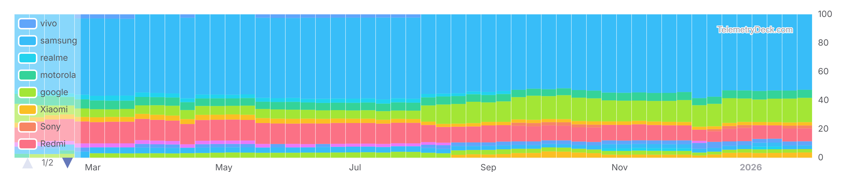 - The share of Redmi has decreased since the middle of 2025 and was at 9.02% at the end of January 2026.