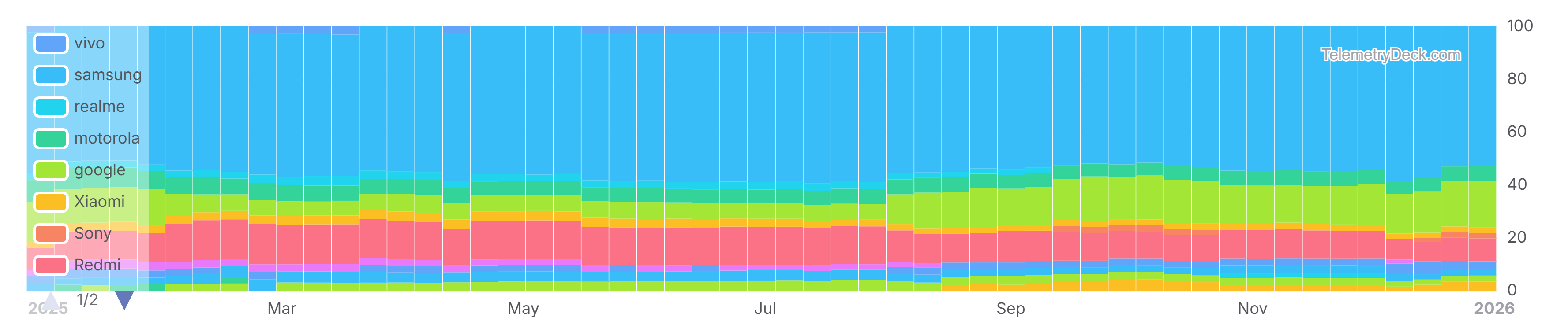 - samsung was the most used device brand in our data as of end of December 2025 with a share of 52.93%. The share has been quite stable all year.
