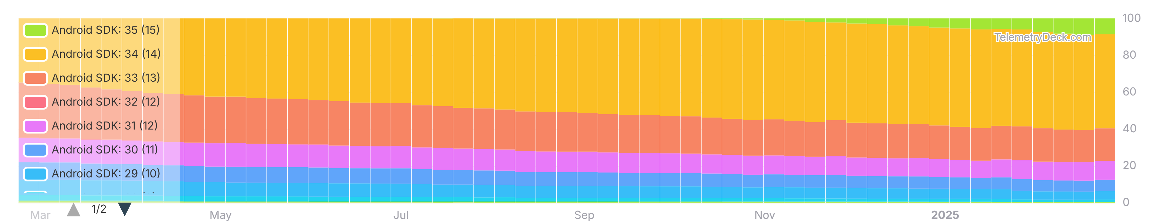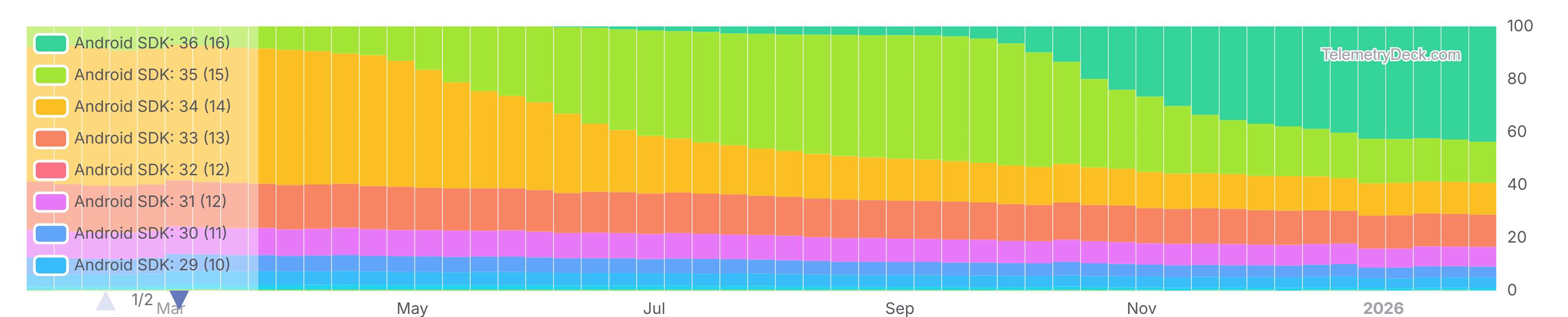 - SDK 35 (15) started 2025 with a share of around 5% and came close to having a share of 50% in September 2025. It has declined since then to 15.52% as of end of January 2026.