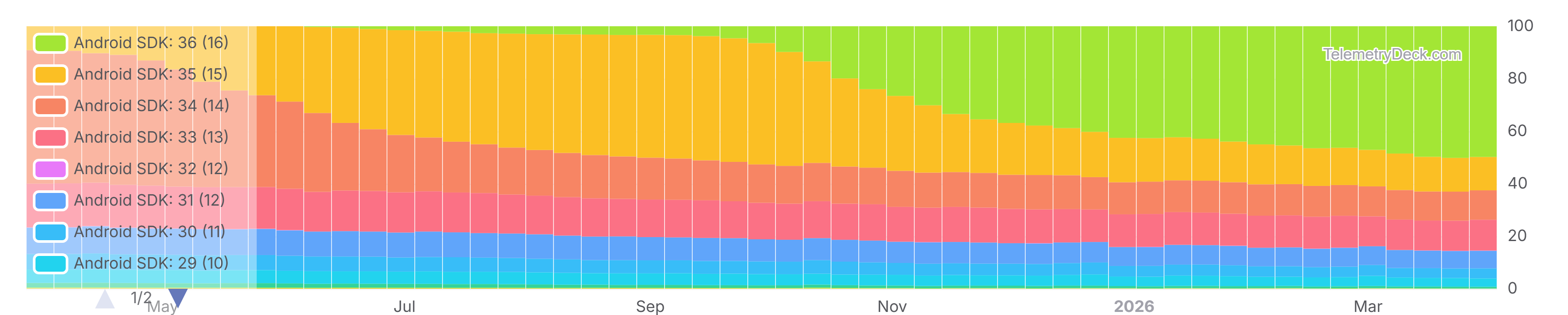 - SDK 35 (15) started 2025 with a share of around 5% and came close to having a share of 50% in September 2025. It has declined since then to 12.72% as of end of March 2026.