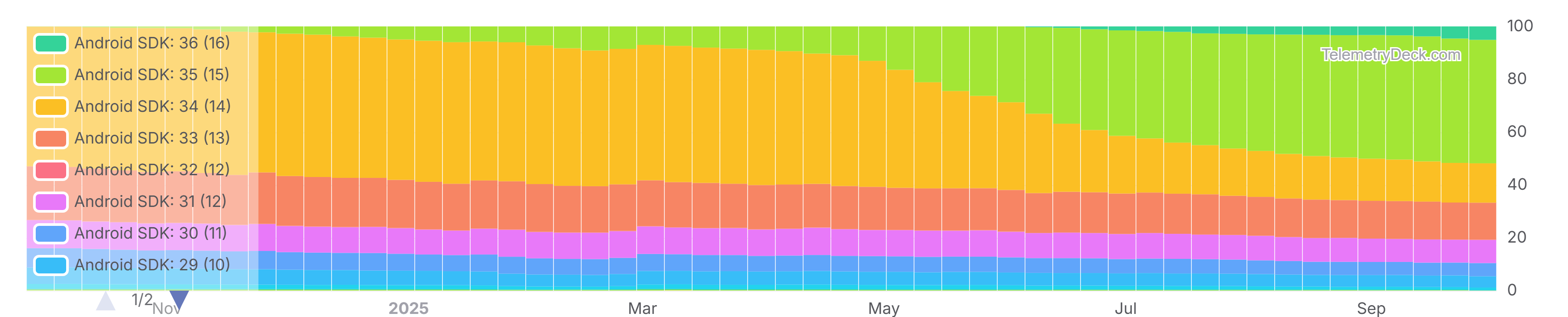- SDK 36(16) appeared for the first time in the top ten most used versions during June 2025 and has been steadily increasing its share to 5.09% at the end of September.