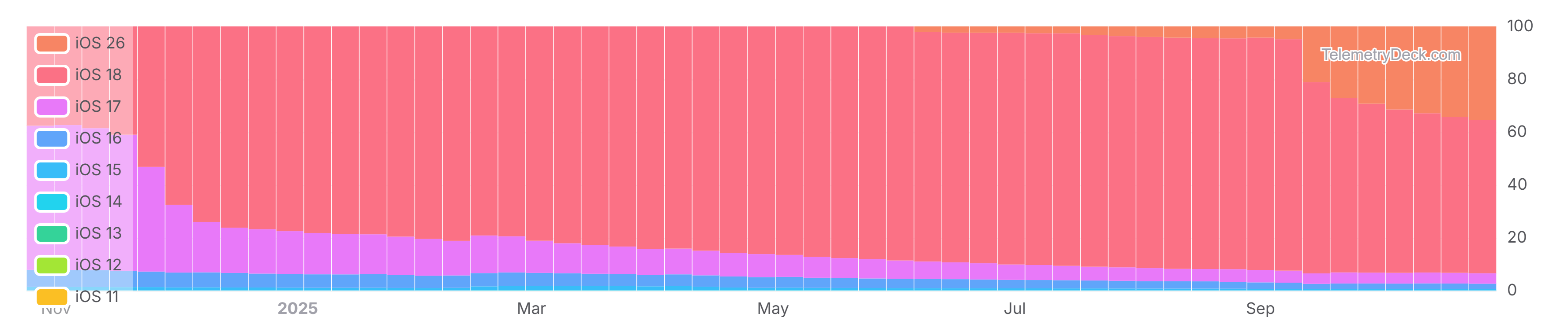 - iOS 19 and iOS 26 are in general the same version of iOS with differences in development environments used in building the app. For that reason, iOS 19 is most likely still to be reported for an extended period of time. For this survey the sum of iOS 19 and iOS 26 is taken and displayed as iOS 26. Digging deeper into the ratio between iOS 19 and iOS 26, at the end of September iOS 26 was responsible for over 99% of the accumulated value displayed in this chart.