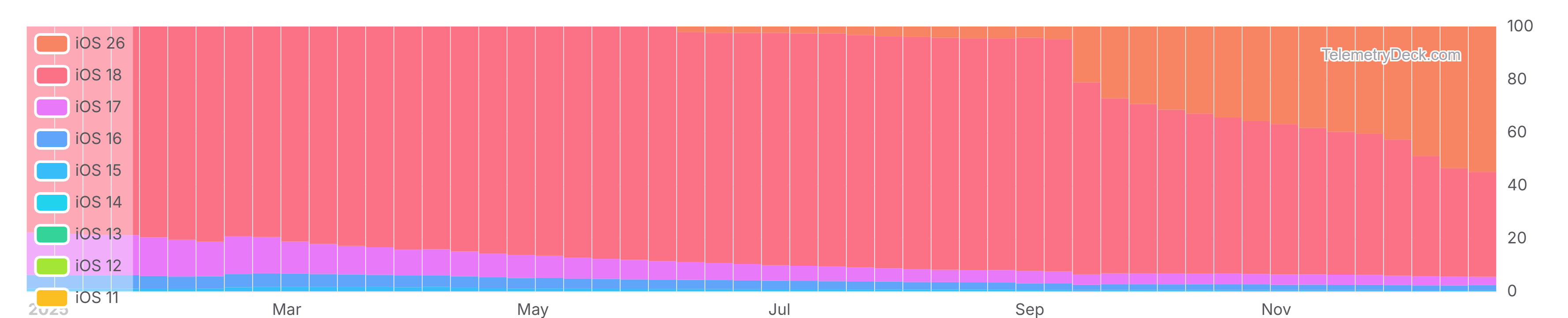 - iOS 19 and iOS 26 are in general the same version of iOS with differences in development environments used in building the app. For that reason, iOS 19 is most likely still to be reported for an extended period of time. For this survey the sum of iOS 19 and iOS 26 is taken and displayed as iOS 26. Digging deeper into the ratio between iOS 19 and iOS 26, at the end of November iOS 26 was responsible for over 99% of the accumulated value displayed in this chart.