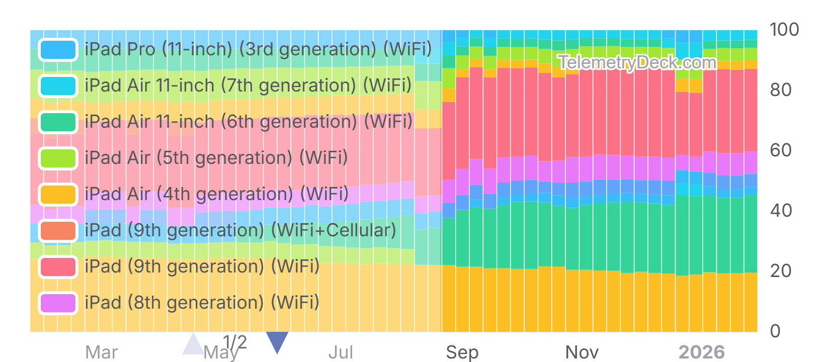 - The iPad (9th generation)(WiFi) had the highest share with over 28% at the end of November 2025. During December the model's share decreased considerably and was at around 21% at the end of the month. In the beginning of 2026 the share increased again to 27.40% at the end of January. This may be caused by characteristics of our dataset and not be representative of an overall phenomenon.