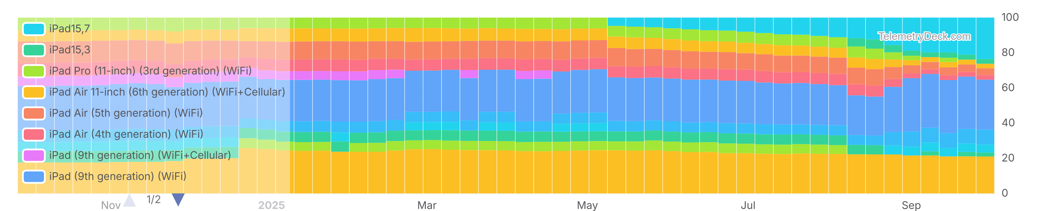 This chart shows the top 10 models of iOS iPads for each week in the last year. Values are percentages.