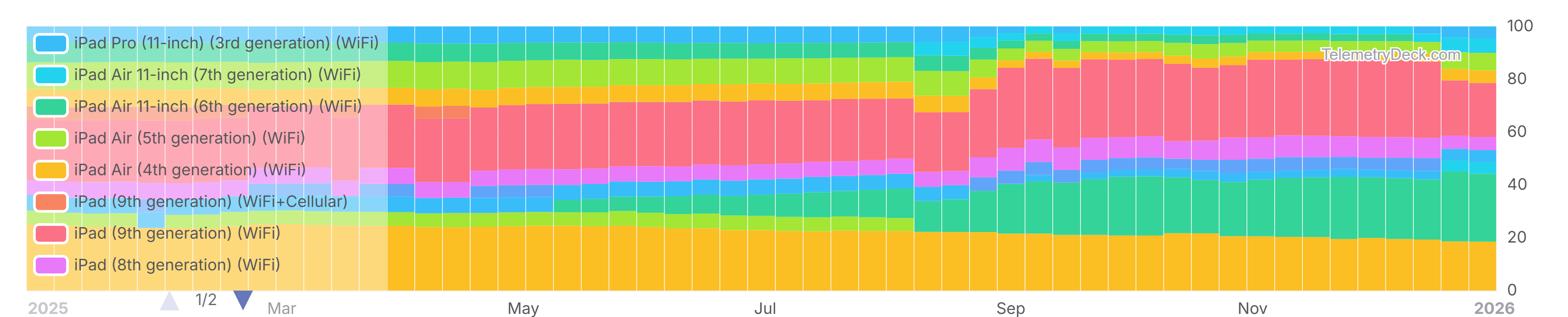 - The shares of iPad devices tend to be rather stable. The iPad (11th generation) (WiFi) has seen a considerable increase over the last months though. After entering the most used devices in May it had the second highest share with 23.45% as of the end of November 2025. After a further increase to 25.74% in December it was the model with the highest share at the end of 2025.