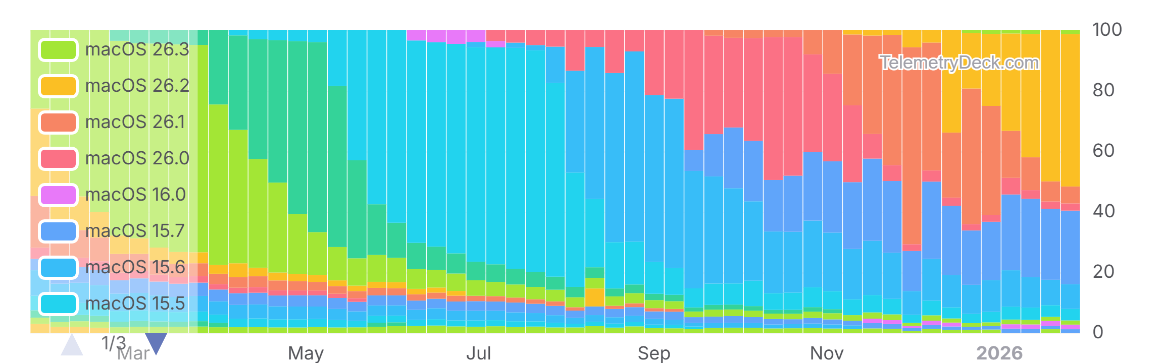 - The share of macOS 26.0 has been volatile. It was at over 47% during October and has since then declined to 2.38% as of end of January 2026.