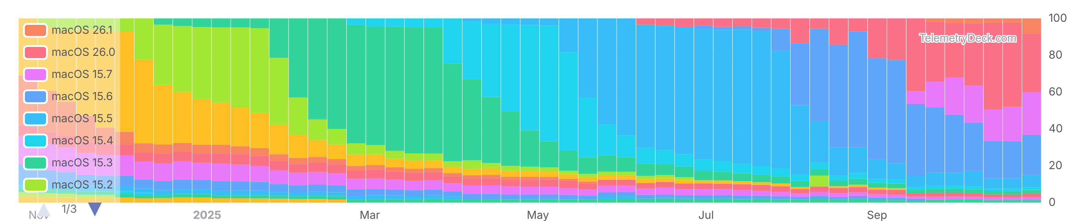 - The share of macOS 26.0 is continuing to be volatile in our dataset. It was at over 47% during October, before finishing the month at 31.70%. As there has been a significant growth of our dataset over the last months volatility like that may rather be caused by our increasing data and not be a general trend.