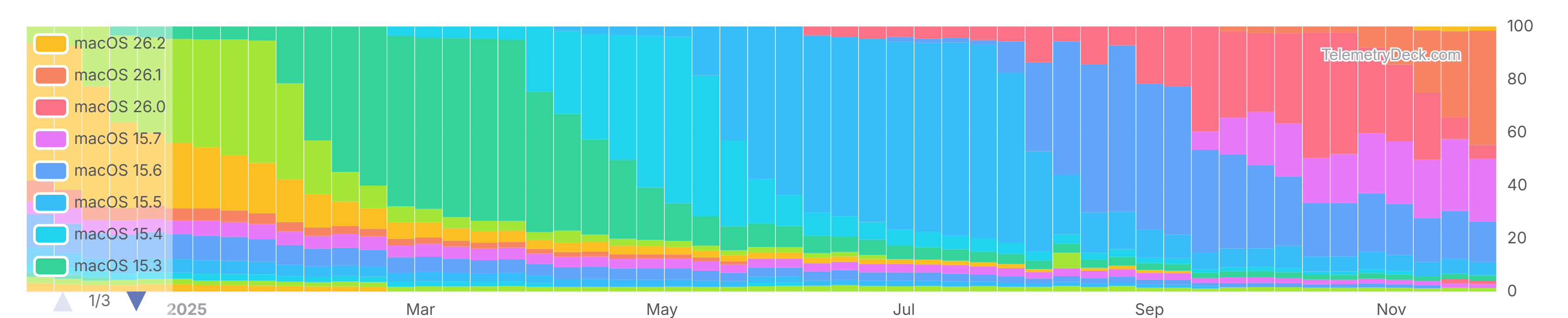 - The share of macOS 26.0 has been volatile. It was at over 47% during October and has since then declined to 5.21% as of end of November. As there has been a significant growth of our dataset over the last months volatility like that may be caused by our increasing data rather than by a general trend.